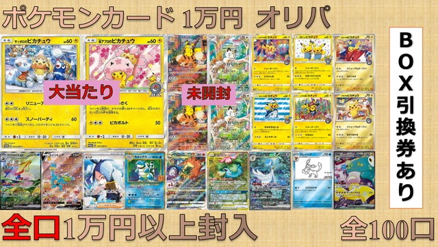 ポケモンカード 10000円 オリパ 1口 10,000円、全100口。 三連休スペシャル第2弾。ピカチュウオリパになります!今では手に入らないピカチュウが1万円で手に入ります。引換券も豊富でハズレでも1万円以上が確定の激アツ仕様です。 早い者勝ちです、完売次第終了。 内容 シングルカード1-4枚 中には引換券が含まれます。引換券のコードと写真をdmまたはメールアドレス宛までご連絡くださいませ。 ※注意事項 ・オリパの仕様上当たりハズレがあることをご了承ください。 ・傷ありのカードが含まれる場合がございます。 ・入金後の返品・キャンセルは承りません。 ・原則発送は2日以内に発送しますが、大量注文等で遅れる場合がございます。 ・過去にキャンセル履歴のある方、低レビューをした方はご購入頂けません。 ・他商品と同封させて頂く場合があります。